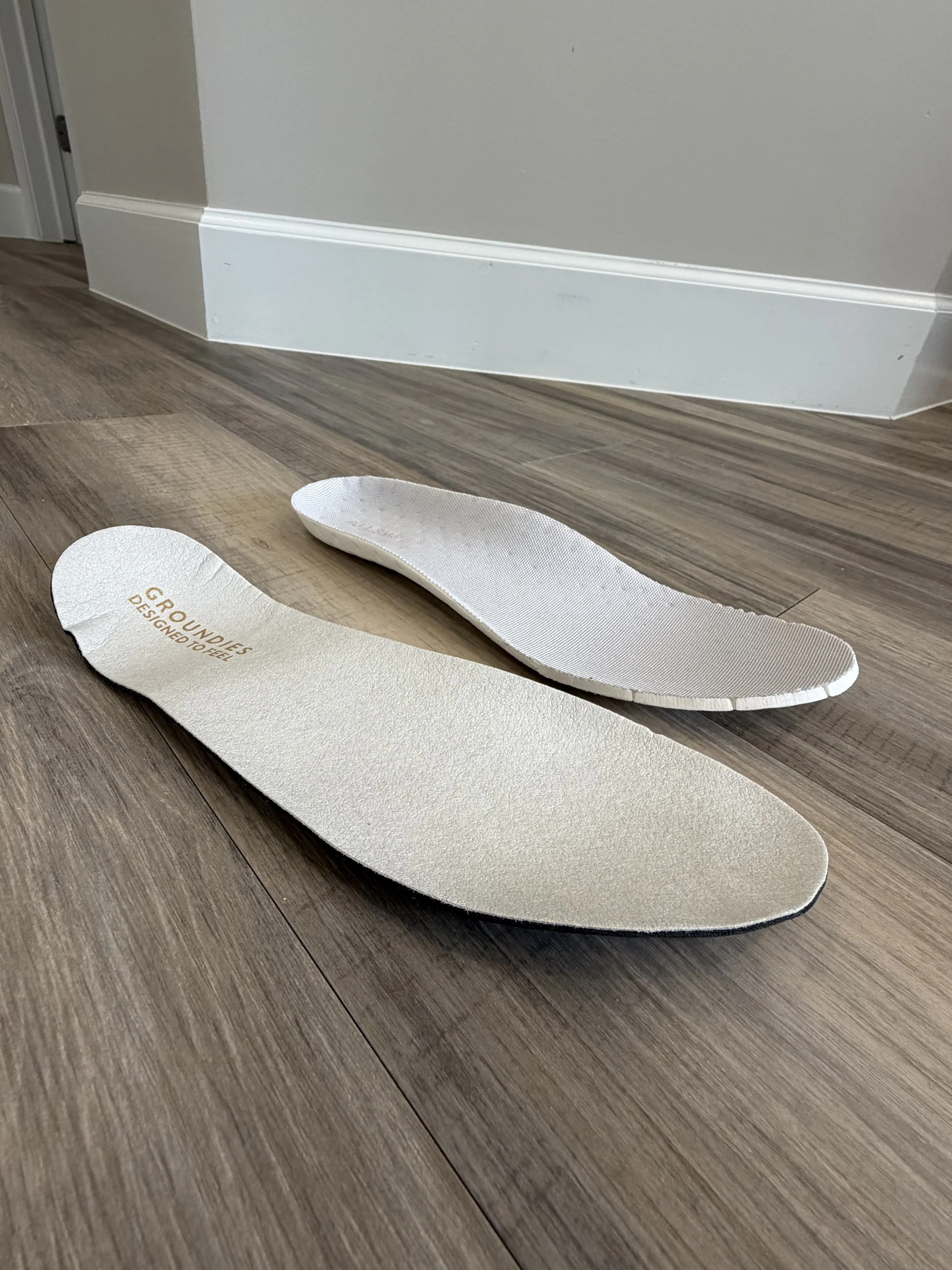Barefoot shoe insole in the front. Traditional athletic shoe insole in the back.